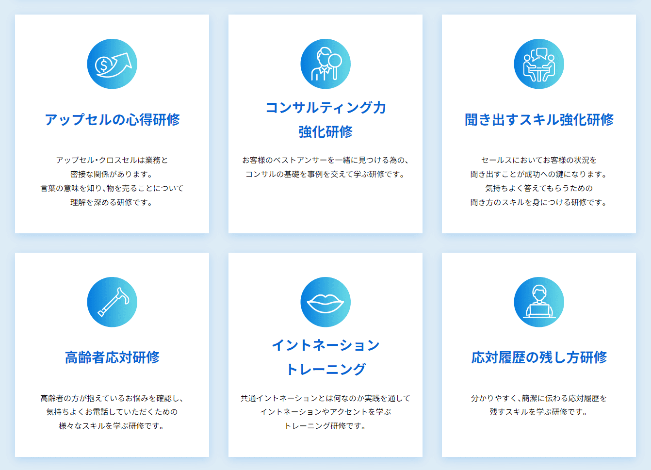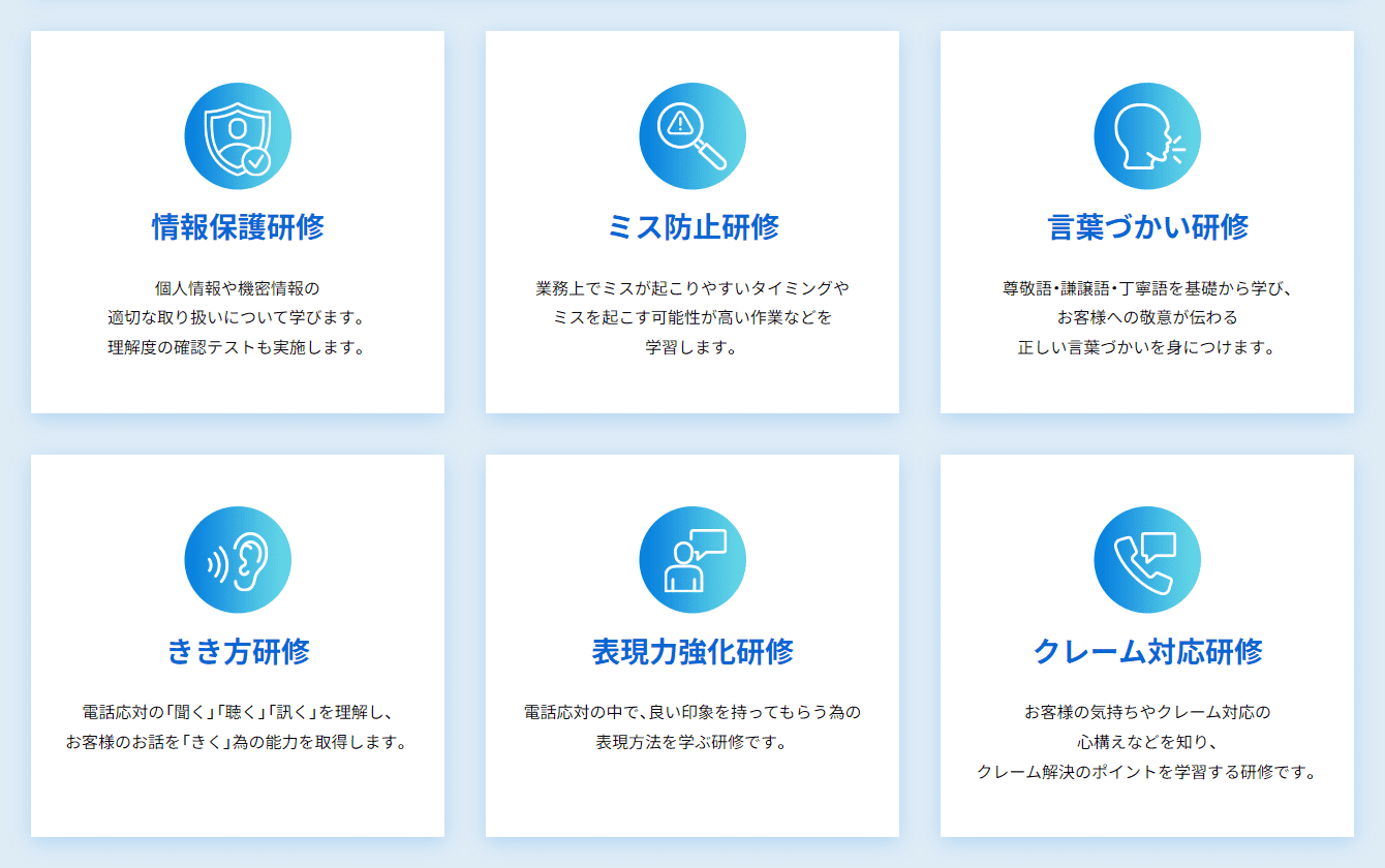プロフェッショナル人材を育成言葉づかい研修やアップセルの心得研修など、オペレーターが一人前になるための研修プログラムをご用意しています。貴社の業務に合った研修もカスタマイズ可能で、コールセンターに精通した講師がプロフェッショナル人材を育成します。