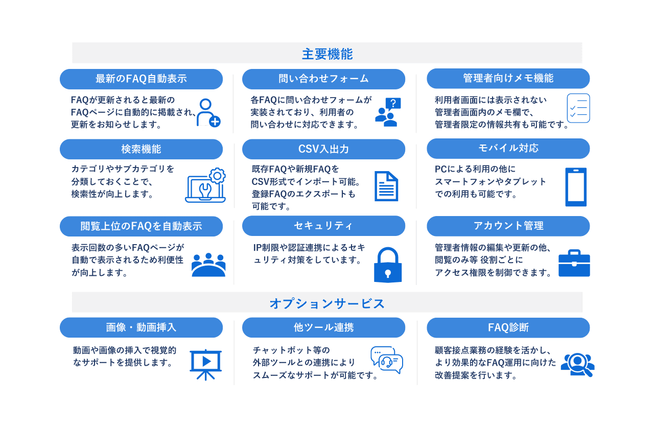 新人オペレーターも安心して業務が可能業界・業種を問わず、様々な場面でご利用いただけるFAQサイトを簡単に構築可能。社内向けのサポートで情報の一元化や業務の効率化を図るだけでなく、顧客向けのFAQを作成することも可能です。