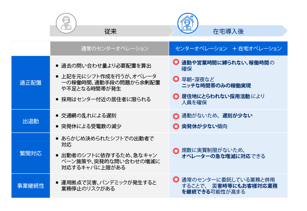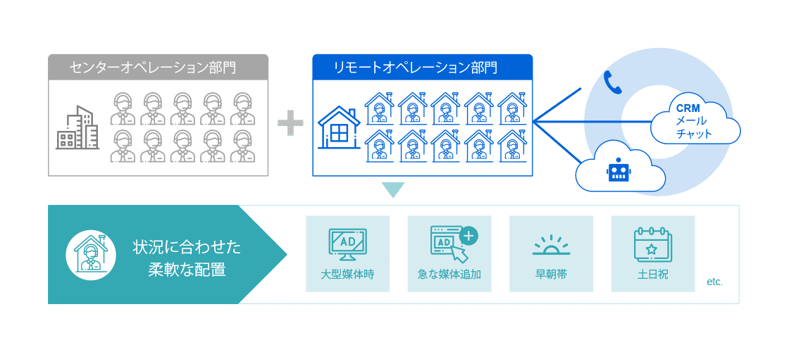 「在宅コールセンター」で離職防止在宅オペレーターを利用して、柔軟な人員体制と安心で高品質なサービスを提供します。センターと在宅によるリモートオペレーションの組み合わせにより、最適化されたハイブリットオペレーションが可能です。